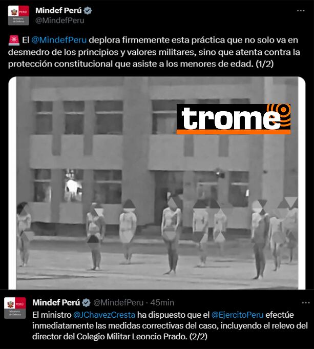 Asimismo, se indicó que Jorge Chávez Cresta, a cargo del Ministerio, ordenó al Ejército del Perú tomar acciones correctivas de manera inmediata: “El Ministerio de Defensa deplora firmemente esta práctica que no solo va en desmedro de los principios y valores militares, sino que atenta contra la protección constitucional que asiste a los menores de edad”.