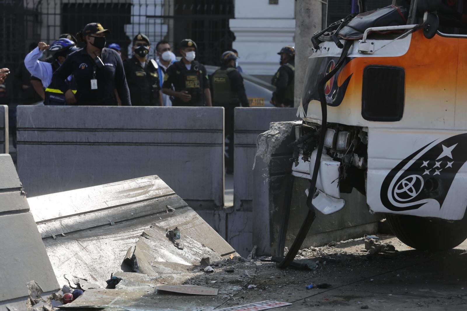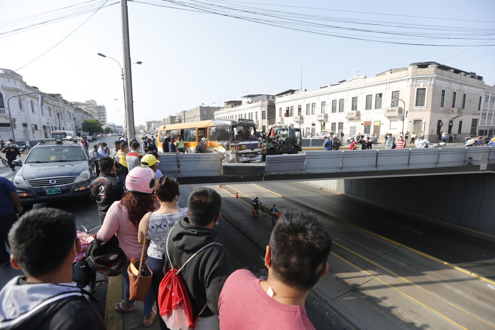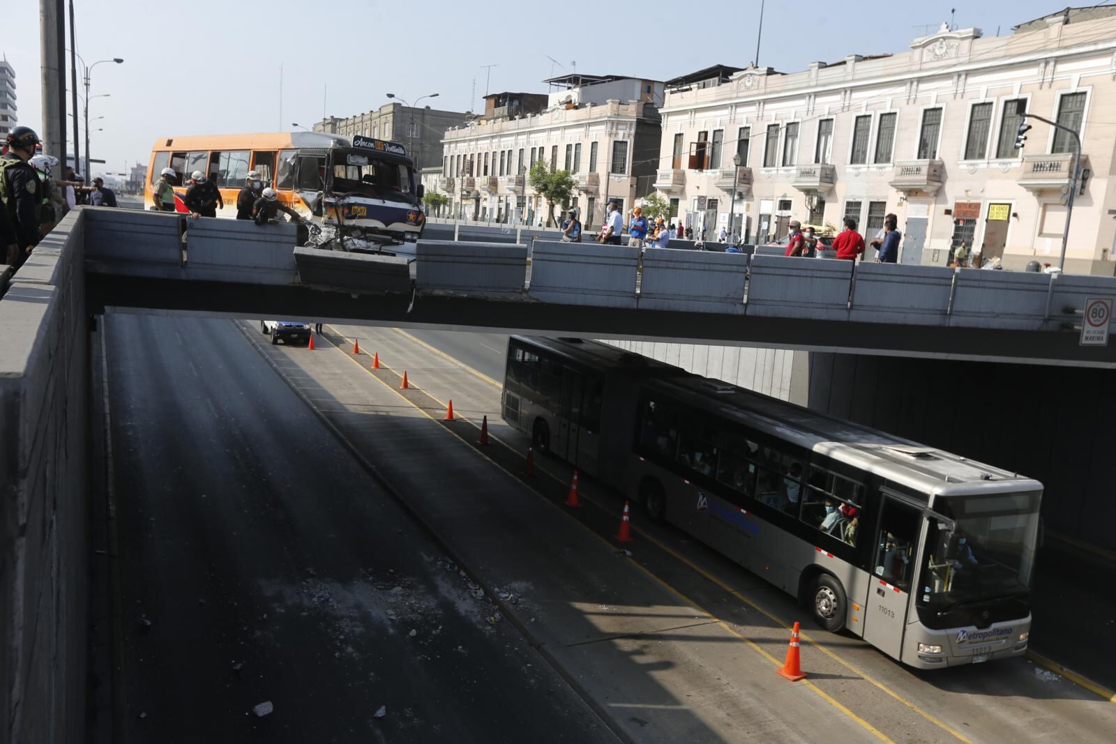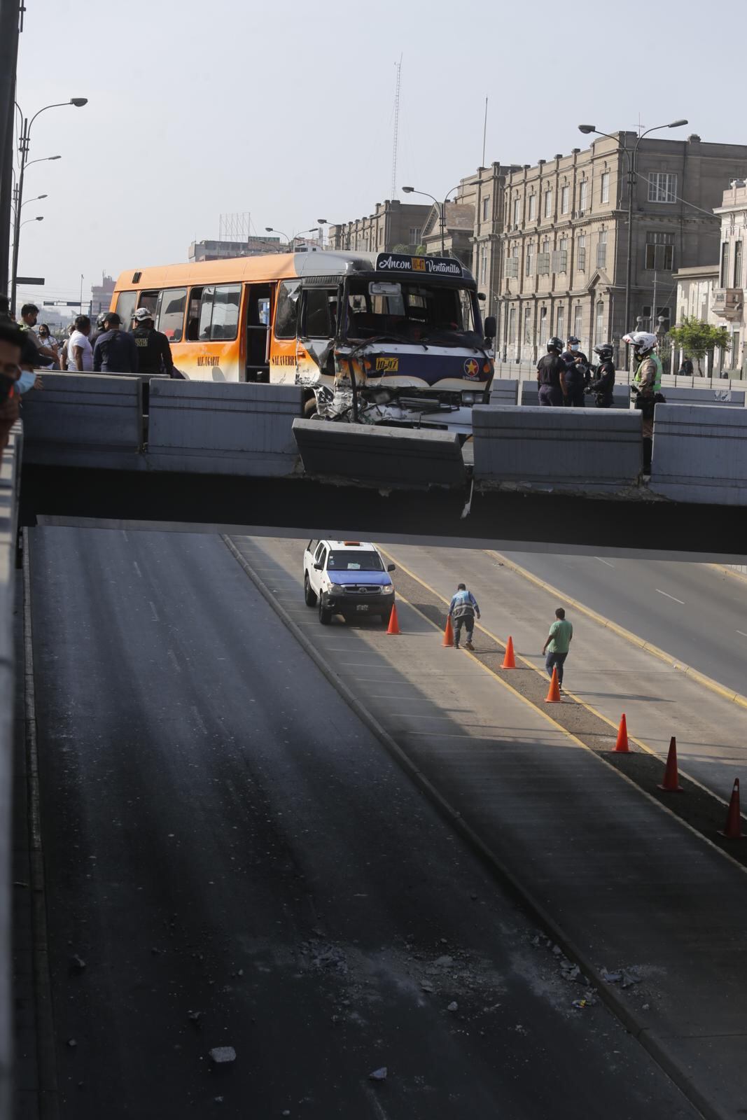Vieron la muerte muy de cerca. Una cúster de transporte público con más de 25 pasajeros, que iba a excesiva velocidad, se pasó la luz roja del semáforo, chocó con otra unidad y ambas tumbaron parte del muro de concreto del puente Quilca de la avenida Alfonso Ugarte, en el centro de Lima. El vehículo causante estuvo a un paso de caer al bypass. Hubo dos heridos.