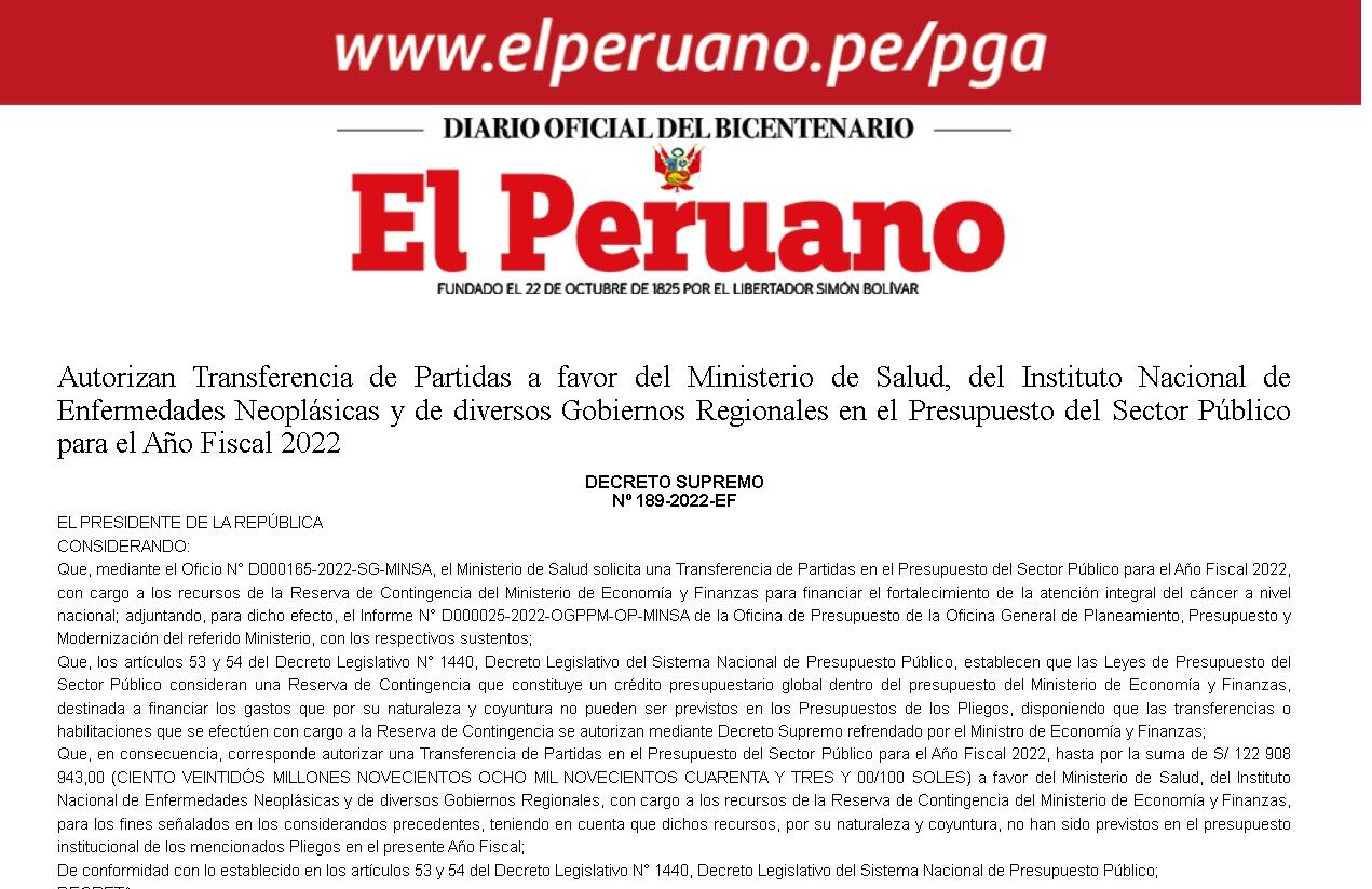 Mediante Decreto Supremo 189-2022-EF, publicado hoy en el Diario Oficial El Peruano, se aprobó dicho dinero a favor del Ministerio de Salud (Minsa), el Instituto Nacional de Enfermedades Neoplásicas (INEN) y diversos gobiernos regionales, para financiar el fortalecimiento de la atención integral del cáncer en el país.