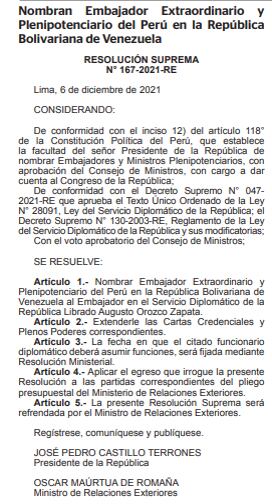 El Gobierno de Pedro Castillo nombró este martes al diplomático Librado Augusto Orozco Zapata como embajador del Perú en la República de Venezuela. La designación se oficializó mediante la resolución suprema N° 167-2021-RE publicada en el diario El Peruano. La norma lleva las firmas del presidente Pedro Castillo y del ministro de Relaciones Exteriores, Óscar Maúrtua.