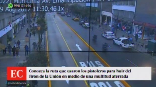 En las imágenes se ve que luego de salir de Jirón de la Unión, un sujeto emprende la huida hacia el Jirón Puno. Al llegar a la avenida Emancipación, las cámaras de seguridad captan a dos motos. Se observa que los vehículos circulan por la vía del Metropolitano de la Estación La Unión. Hay dos personas en cada moto.