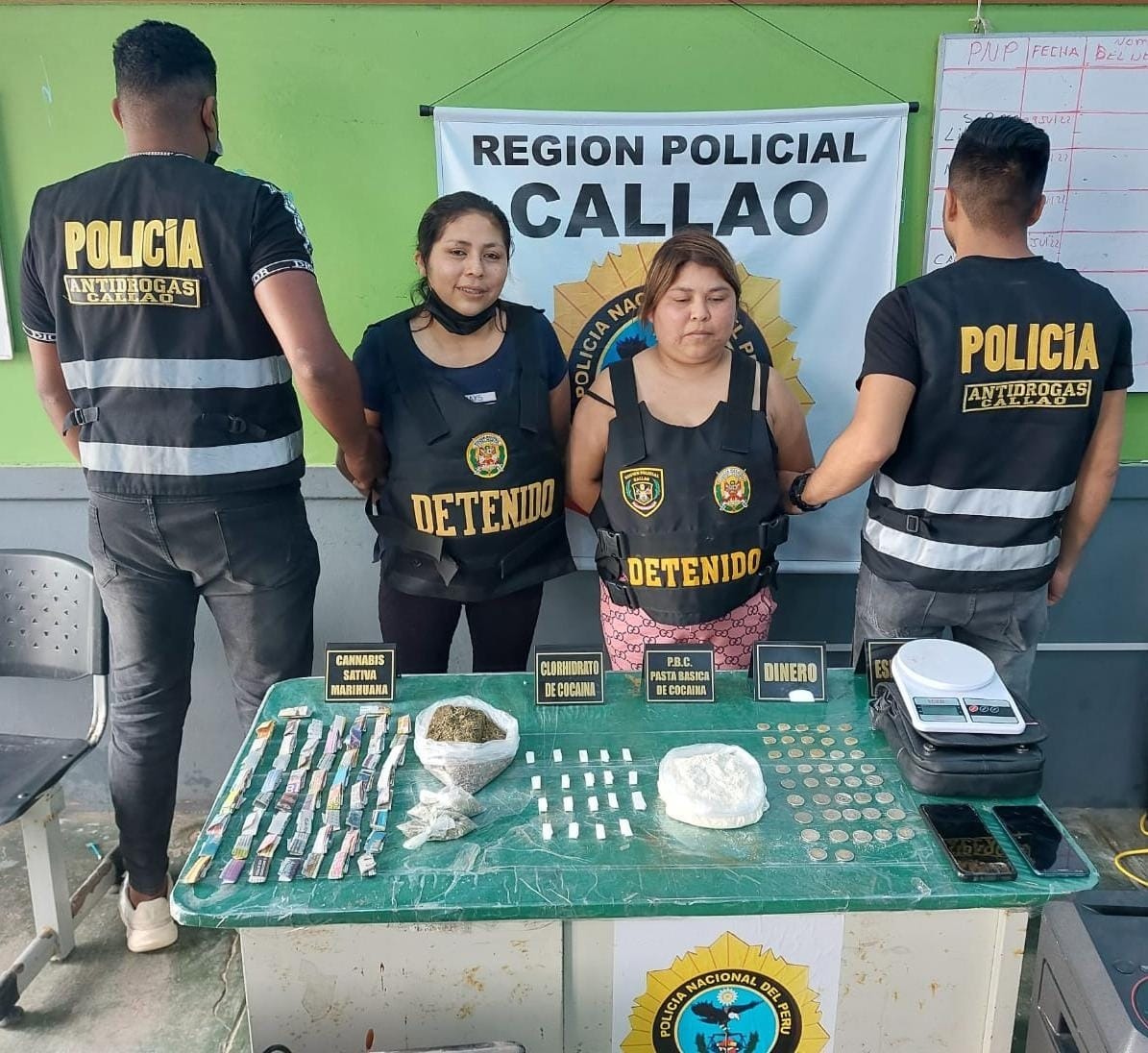 Dos mujeres que eran conocidas por vender drogas en el asentamiento humano Alberto Secada en el Callao, fueron detenidas por agentes policiales del Departamento Antidrogas del Callao, que al registrar su vivienda encontraron 700 gramos de marihuana y 900 gramos de Pasta Básica de Cocaína.