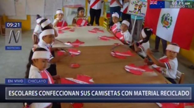 Ellos junto a su profesora, a pesar de los bajos recursos de sus padres confeccionaron con papel reciclado camisetas y vinchas para hacer vivas a la selección peruana.