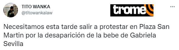 “Necesitamos esta tarde salir a protestar en la Plaza San Martín por la desaparición de la bebé de Gabriela Sevilla”, escribió.