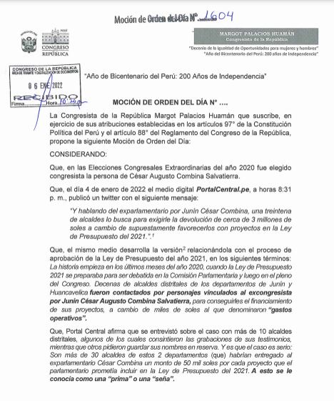La moción de Palacios se sustenta en la investigación hecha por el sitio web Portal Central, de Huancayo, el cual reveló esta semana que Combina habría solicitado y recibido dinero de unos 50 alcaldes en las regiones de Junín, Huancavelica y Pasco a cambio de que sus proyectos fueran incluidos en la Ley de Presupuesto del 2021.