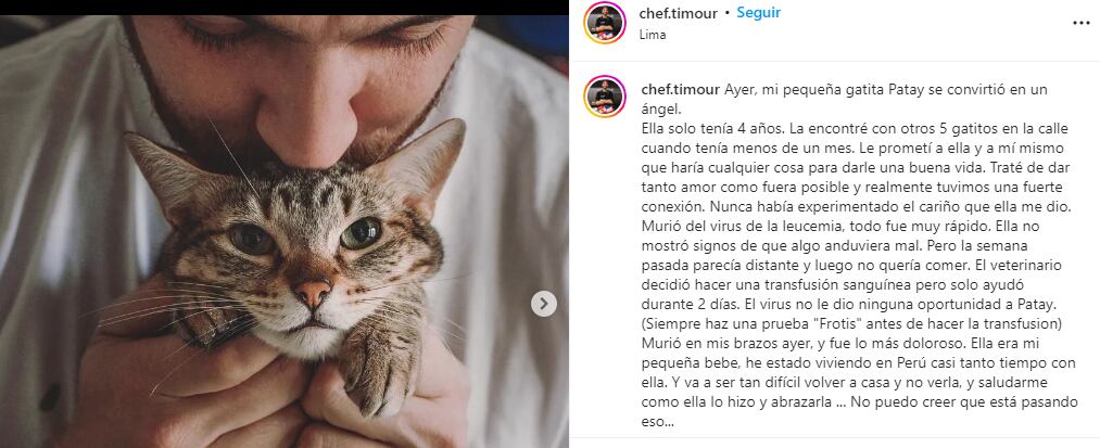 El chef vino a Lima para conocer más sobre nuestra cocina peruana, pero en ese interín se enamoró del Perú, tanto así, que decidió emprender con un negocio de comida. Y para cumplir su sueño dejó a su familia y con el tiempo llegó su gatita inca, quien ocupó el espacio más especial de su vida. Él estaba muy orgulloso de tenerla y aunque le dió amor y todos los cuidados como si fuera su propia bebé, Timour siente que pudo haber hecho más por ella.