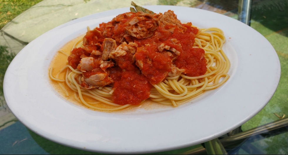 TALLARINES ROJOS AL ATUN: Medio kilo de fideos, lata de atún, tomates licuados, ajo molido y una cebollita en cuadritos, aceite, hongos, laurel, tuco.