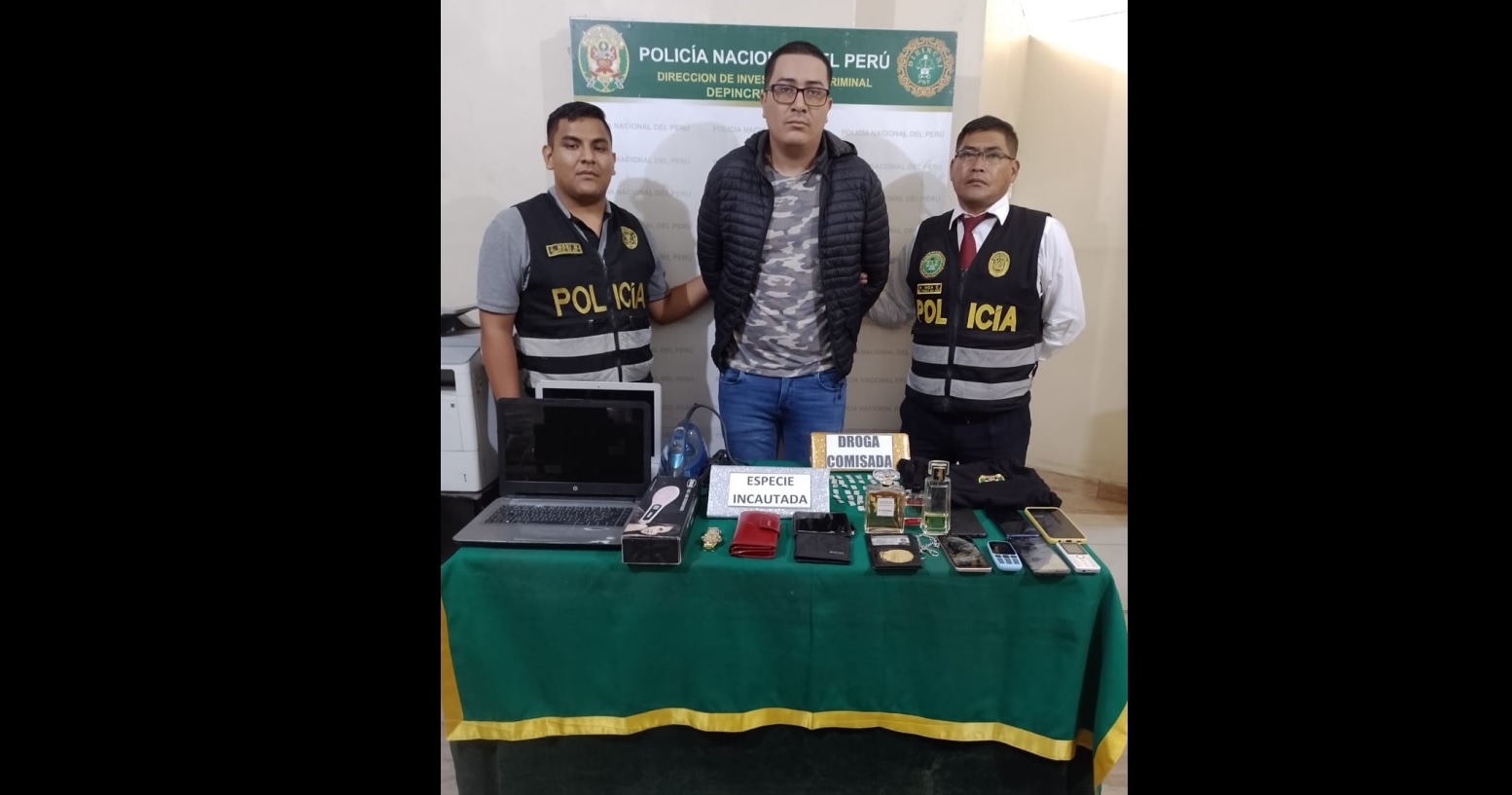 “Personal policial montó un operativo y luego de incursionar en tres domicilios lograron ubicarlo. Cuando los policías encontraron el carné de identidad, que era el objetivo, se dieron con la sorpresa que había 7siete celulares más, perfumes de marca, dos laptops y carteras de reconocidas firmas”, señaló el jefe de la División Policial Norte 2, coronel PNP Rómulo Reyes.