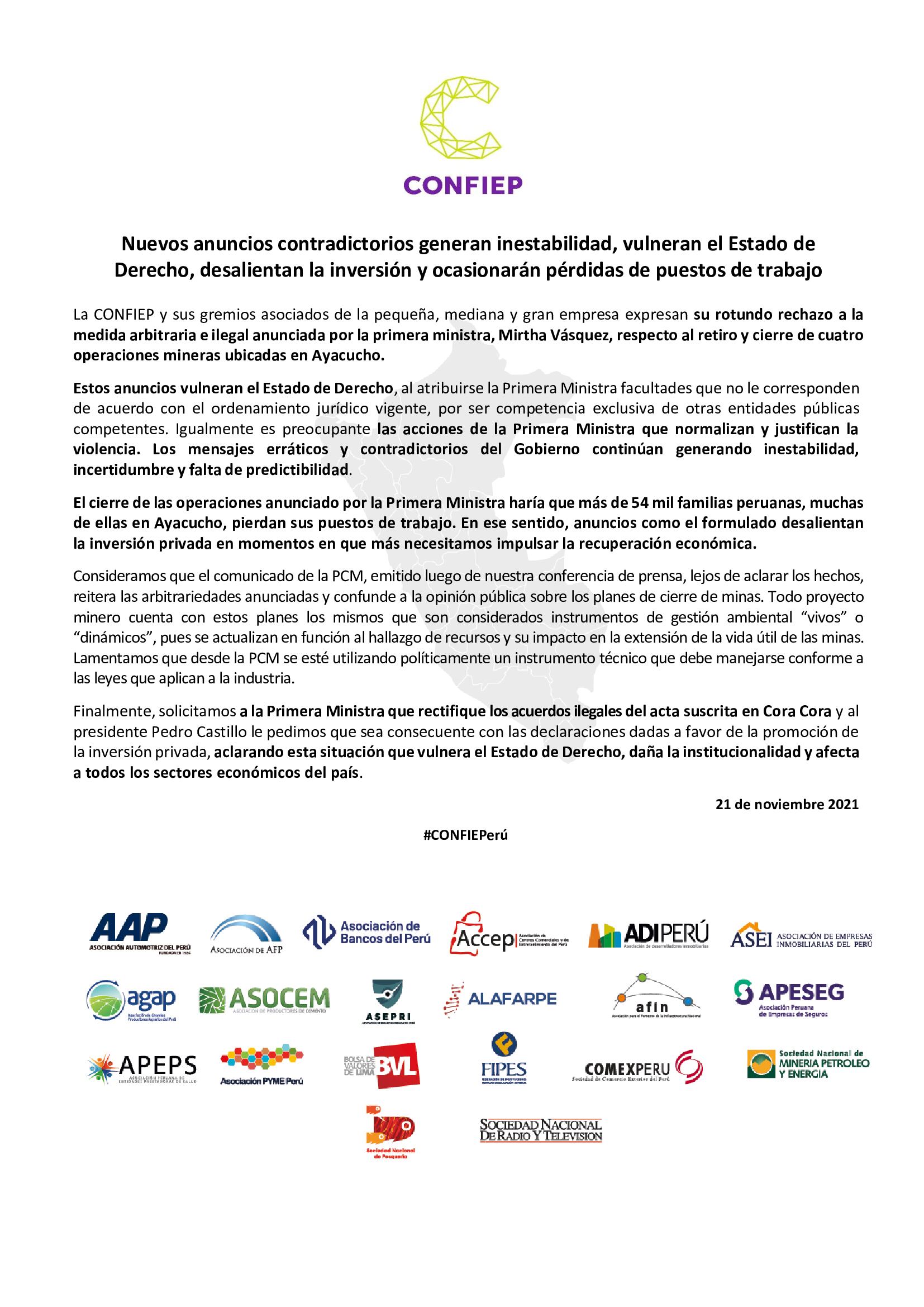 Este pronunciamiento se suma a la posición que difundieron este fin de semana junto a otros representantes del sector privado. En una conferencia de prensa, en la que Confiep estuvo junto a ejecutivos de la Sociedad Nacional de Minería, Petróleo y Energía (SNMPE), el Instituto de Ingenieros de Minas del Perú (IIMP) y las empresas mineras Compañía Minera Ares, Apumayo y SAMI (Breapampa), expresaron su rechazo hacia esta medida del Ejecutivo.