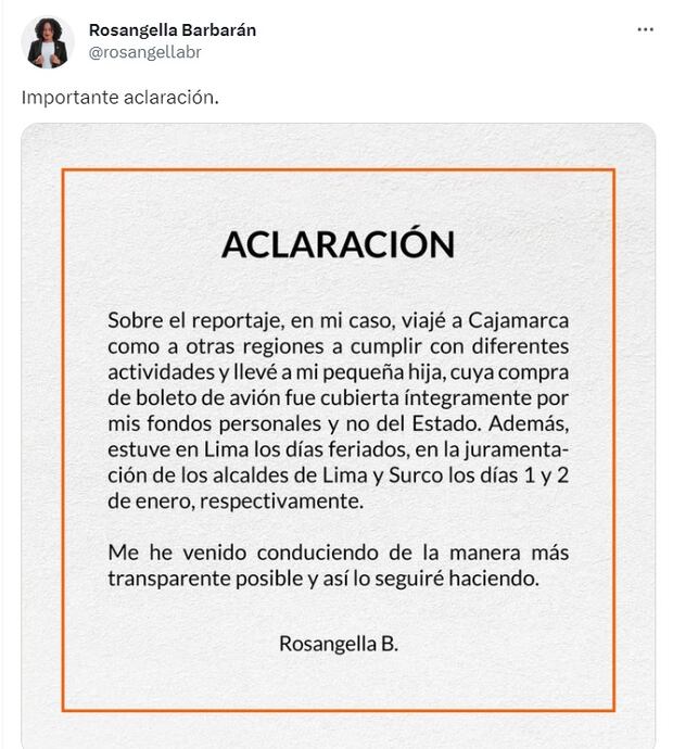 Sobre el viaje a Cajamarca con su hijita, Rosangella aclaró que ella compró el pasaje con sus ingresos y no con dinero del parlamento. “Viajé a Cajamarca como a otras regiones a cumplir con diferentes actividades ”, explicó.