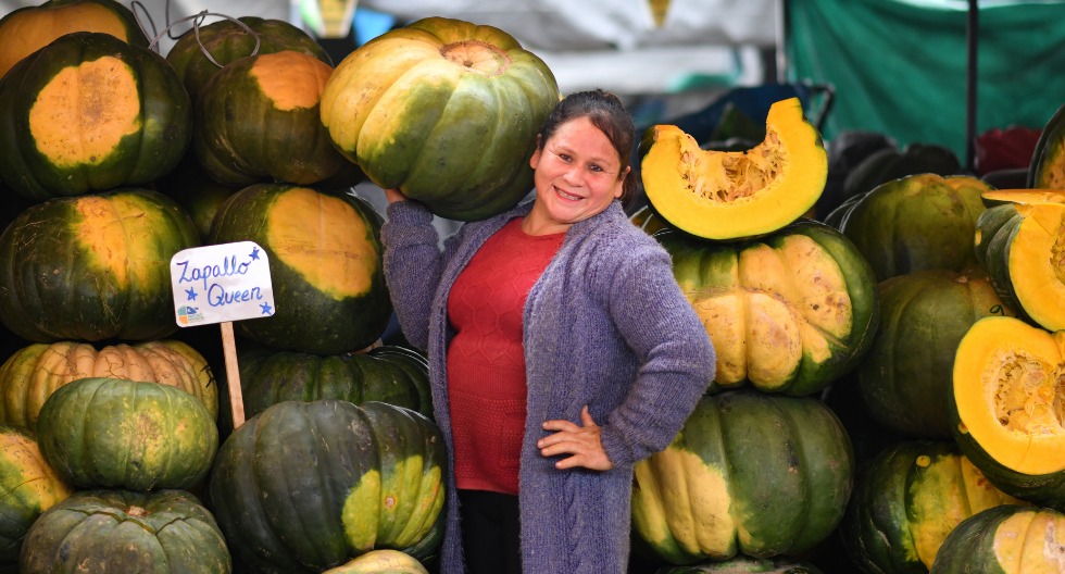 PERUANO QUE SE RESPETA. Ella no le corre al trabajo duro, carga zapallos de más de 30 kilos y trabaja más de doce horas en su puesto D279 del Mercado Tierra Prometida de Santa Anita. Zoila Pomiano Anaya (42) es una brava comerciante cajamarquina, que tiene más de 20 años de experiencia, en el negocio de venta de zapallos. Su carisma y buen humor para ofrecer diferentes variedades y calidades de este producto le ha permitido vender hasta 500 zapallos macre en un solo día. Y no solo es ella, también existen historias de agricultores, que trabajan día y noche, para cosechar buenos productos, y que hoy celebrarán a lo grande el ‘Día Mundial de la Agricultura’.