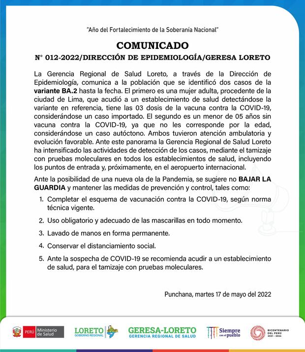 La Gerencia Regional de Salud de Loreto informó que se detectó un caso de la subvariante BA.2, linaje descendiente de la variante ómicron del COVID-19 en una niño de 5 años. El análisis se llevó a cabo en el Centro de Investigación en Enfermedades Tropicales “Máxime Kuczynski”, a principios del mes de mayo, informó el director regional de salud de Loreto, Chaner Zumaeta, a RPP.