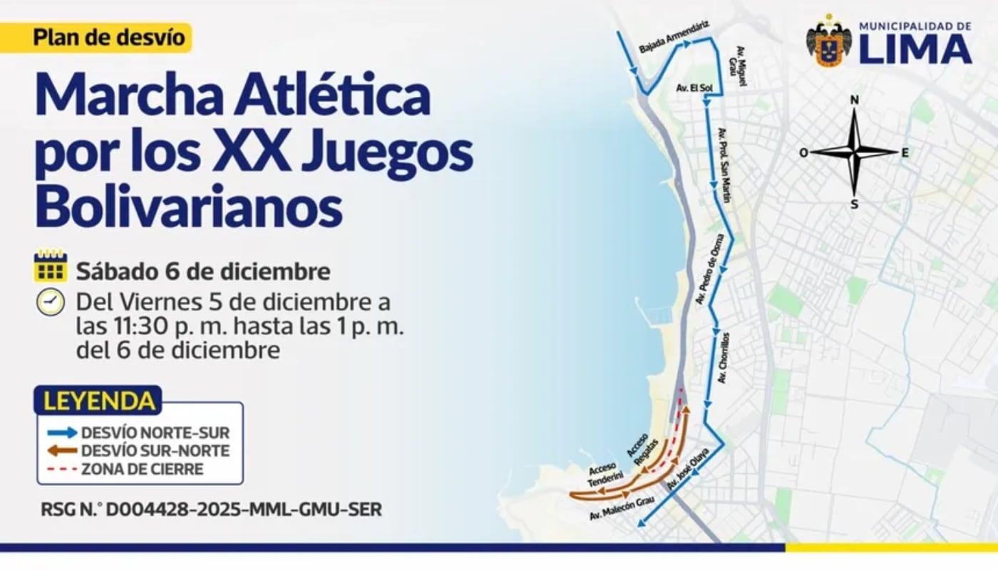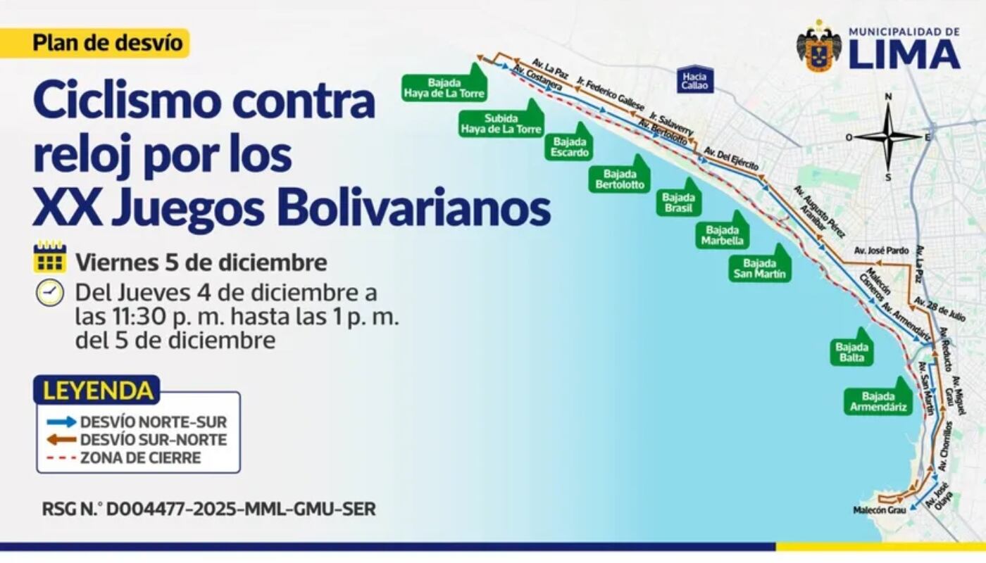 Este no será el único cierre. La Municipalidad de Lima confirmó que el jueves 4 de diciembre habrá una nueva restricción total por la competencia de ciclismo, desde las 11:30 p.m. hasta la 1 p.m. del viernes 5 de diciembre. El desvío norte-sur seguirá por la Costanera, Bertolotto, Armendáriz, San Martín y José Olaya. En sentido contrario, se utilizarán Chorrillos, Miguel Grau, Reducto, José Pardo, Pérez Araníbar, Del Ejército y La Paz.