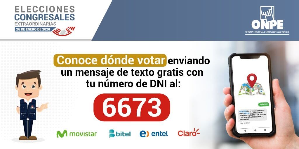 Si todavía no conoces tu local de votación para las Elecciones Congresales Extraordinarias 2020, la ONPE ha establecido alianzas con diversas operadoras de telefonía celular (Movistar, Entel, Bitel, Claro) y con solo un mensaje de texto podrás saber dónde te toca votar. Solo se debe enviar el número de DNI en un mensaje de texto (SMS) al 6673 y en segundos tendrás al alcance el lugar y la dirección de donde deberás emitir tu voto.