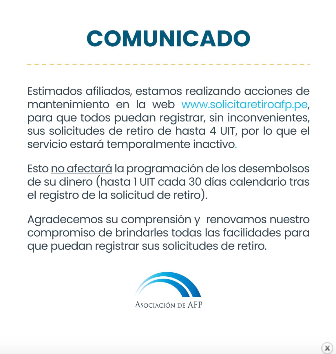 “Estamos realizando acciones de mantenimiento en la web www.solicitaretiroafp.pe, para que todos puendan registrar, sin inconvenientes sus solicitudes de retiro de hasta 4 UIT, por lo que el servicio estará temporalmente inactivo. Esto no afectará la programación de los desembolsos de su dinero (hasta 1 UIT cada 30 días calendario tras el registro de la solicitud de retiro)”, se precisó.
