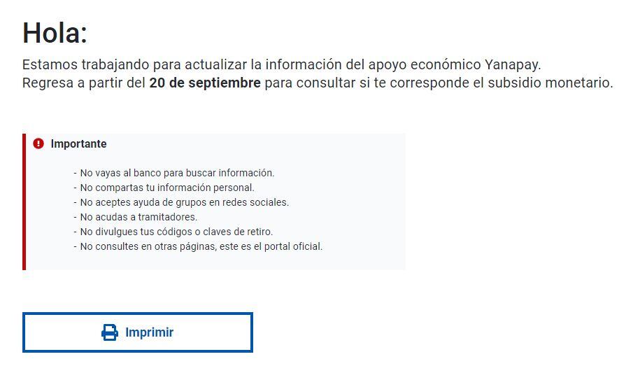 Bono Yanapay 350, todo lo que debes saber. El Gobierno habilitó oficialmente la plataforma virtual (https://consultas.yanapay.gob.pe) para que los peruanos cotejen si serán beneficiados con la entrega Bono Yanapay Perú de 350 soles que comenzó desde el lunes 13 de septiembre. Sin embargo, a muchos les sale el mensaje que “regresa a partir del 20 de septiembre”, por lo que de momento no saben si forman parte o no del padrón de beneficiarios del mencionado subsidio. Aquí te explicamos por qué pasa.