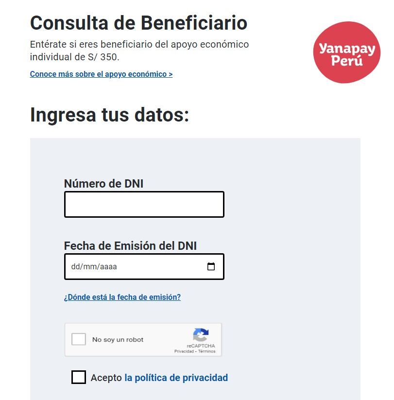 Desde el 13 de septiembre, el Gobierno habilitó de manera oficial la plataforma virtual (https://consultas.yanapay.gob.pe) para que los peruanos consulten si son beneficiarios del Bono Yanapay Perú de 350 soles, además de conocer toda la información sobre dicho subsidio como los criterios de acceso al beneficio económico, los grupos y las modalidades de pago.