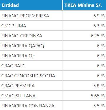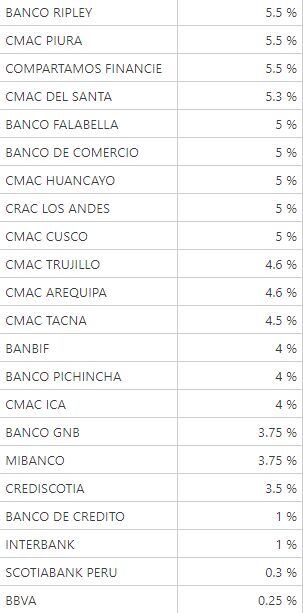 También está la Caja Rural de Ahorro y Crédito Prymera con una tasa de 5.8%, Caja Municipal de Ahorro y Crédito de Sullana registra 5.65% y Financiera Confianza en 5.5%.