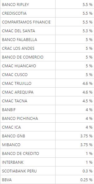 También está la Caja Rural de Ahorro y Crédito Prymera con una tasa de 5.8%, Caja Municipal de Ahorro y Crédito de Sullana registra 5.65% y Financiera Confianza en 5.5%.