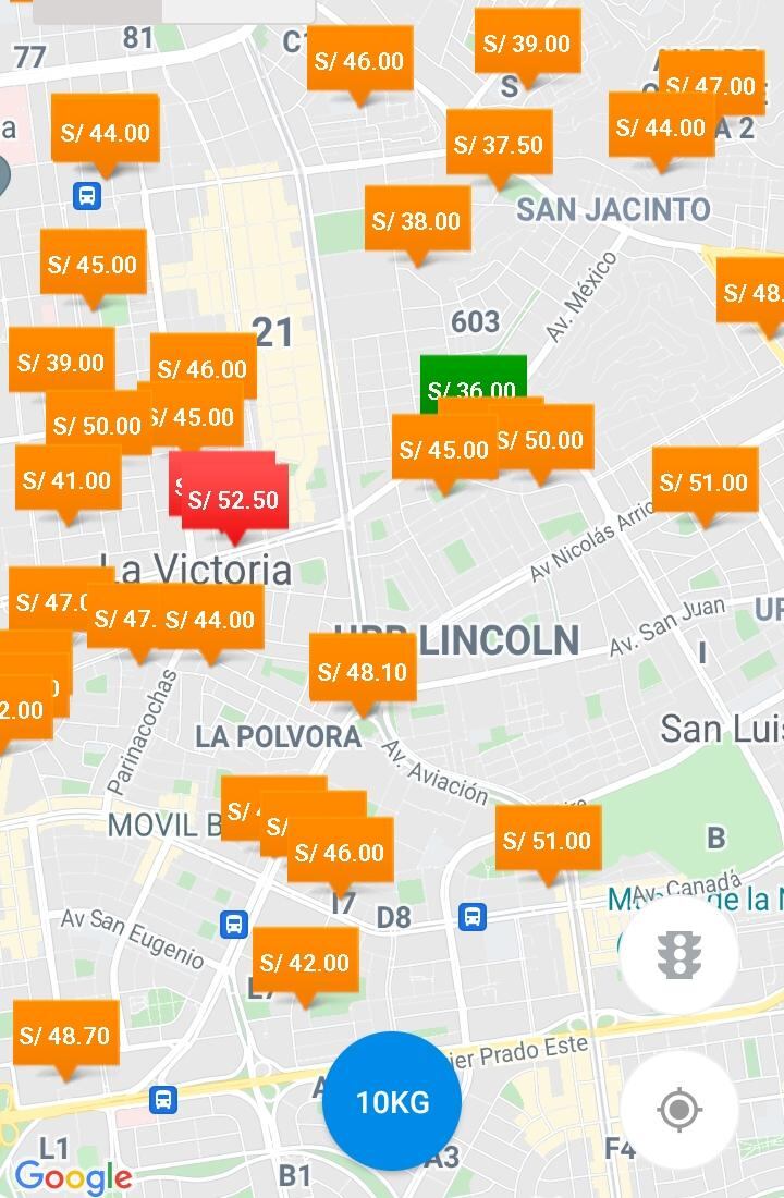Pero para facilidad del usuario, se puede escoger visualizar los establecimientos en una lista ordenada por precios o en un mapa donde resaltará en verde el balón más económico y en rojo el más caro.