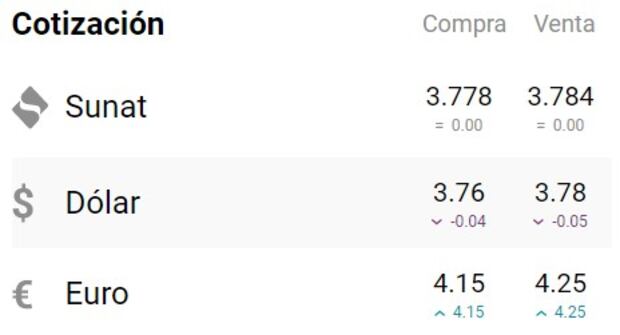 Por otro lado, las casas de cambio y agencias presentan el tipo de cambio en compra y venta en S/. 3.76 y S/. 3.78, respectivamente; según el portal cuantocuestaeldolar.pe.