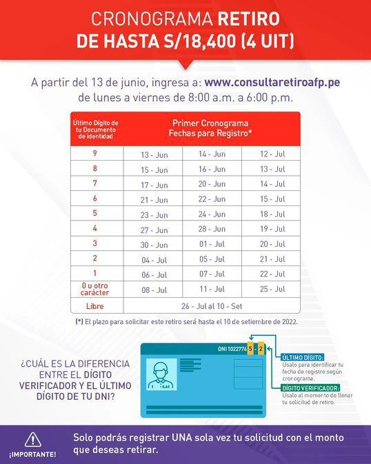 De la misma manera que se realizaron los anteriores retiros de AFP, el cronograma está en función al último dígito del DNI del afiliado.