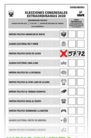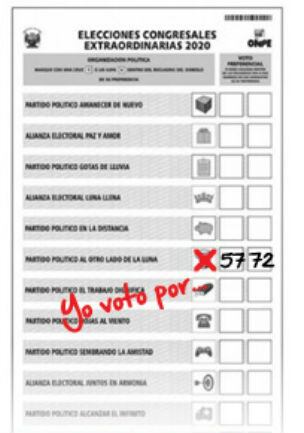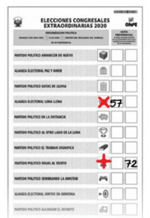 Para que el voto sea correcto, solo se deberá marcar con ‘cruz’ (+) o ‘aspa’ (x) en el recuadro del símbolo partidario. Recuerde que la intersección de las líneas debe estar dentro del recuadro. Otro tipo de marca, o marcar fuera del recuadro, anula el voto. Además, puede hacer uso o no de uno o de los dos votos preferenciales.