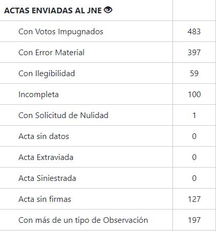 De las 1.167 actas observadas, solo 474 tienen votos impugnados. Al respecto, Jorge Jáuregui, especialista en derecho electoral, señaló que por más que solo sea un voto el impugnado, toda el acta permanece retenida hasta que el JEE resuelva la controversia. Una vez que se supere, el acta es enviada a la ONPE para que se sume al cómputo general.