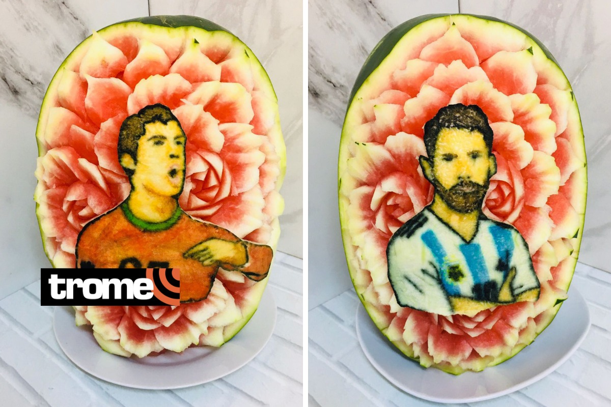 PERUANO QUE SE RESPETA. Si bien nuestra Blanquirroja no participará del Mundial de Qatar 2022, eso no quita la pasión que sienten los hinchas peruanos por el fútbol. Hoy, que inicia la Copa del Mundo, el artista pastelero José Sulca Menacho (36), más conocido como ‘Jochi Garnish’, decidió tallar los rostros de los cracks del mundo, Lionel Messi y Cristiano Ronaldo en dos sandías de gran tamaño y también esculpir en un enorme zapallo el logo del Mundial de Qatar 2022.