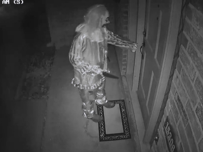 El hombre difundió las imágenes de las cámaras de seguridad de su casa, en la que se pueden ver a un payaso -con un cuchillo en mano- intentando ingresar a su casa. ¡De terror!