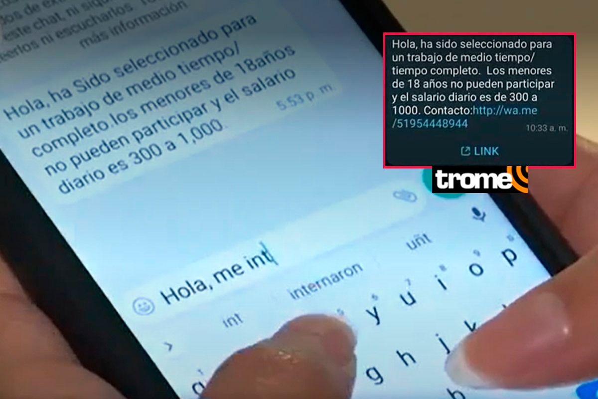 “Hola, has sido seleccionado para un trabajo de medio tiempo/tiempo completo. Los menores de 18 años no pueden participar y el salario es de 300 a 1000 soles. Contacto...”, se lee en uno de los mensajes enviados a sus víctimas.