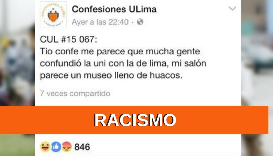 “Tio confe me parece que mucha gente confundió la uni con la de lima, mi salón parece un museo lleno de huacos”, decía el mensaje. Inmediatamente algunos seguidores de la página decidieron comentar: "Aborígenes" o "Huaco huaqueando a otro huaco detectado". El racismo continuó.