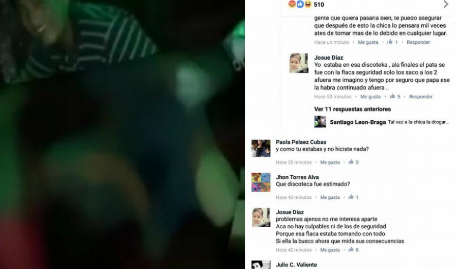 "Problemas ajenos no me interesa. Acá no hay culpables, ni los de seguridad, porque esa flaca estaba tomando con todo. Si ella la buscó ahora que asuma las consecuencias", dice un usuario llamado Josue Díaz. Pero lo increíble es que este joven asegura haber estado en esa discoteca el mismo día en que violaron a la muchacha. "Yo estaba en esa discoteca", dice en otro comentario en Facebook y no hizo nada.