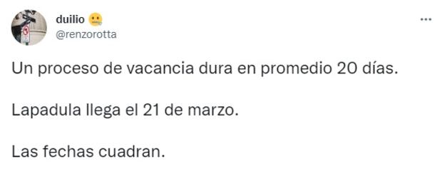 “Un proceso de vacancia dura en promedio 20 días. Lapadula llega el 21 de marzo. Las fechas cuadran”, tuiteó el usuario @renzorotta.