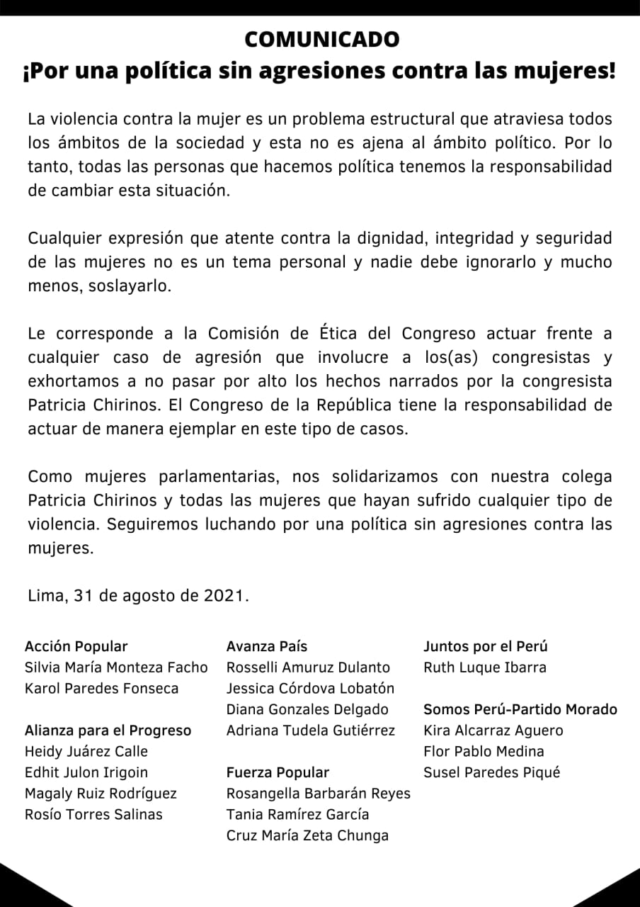 En ese sentido, pidieron que la Comisión de Ética del Congreso actúe “frente a cualquier caso de agresión que involucre a los (as) congresistas y exhortamos a no pasar por alto los hechos narrados por la congresista Patricia Chirinos”.