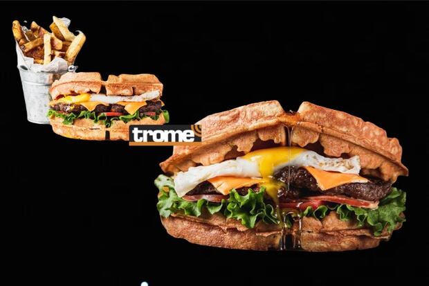 - La rebelde: Hamburguesa de carne, huevo frito, queso cheddar, lechuga, tomate y vinagreta servida en waffle con papas fritas y, si desea, miel encima.