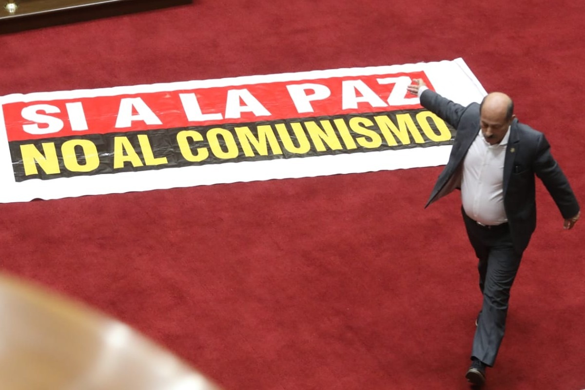 En medio de la gran expectativa de la población por la votación en el Congreso del adelanto de las elecciones generales; el parlamentario Héctor Valer bajó hasta el medio del hemiciclo y colocó un cartel pidiendo la paz y en rechazo al comunismo.