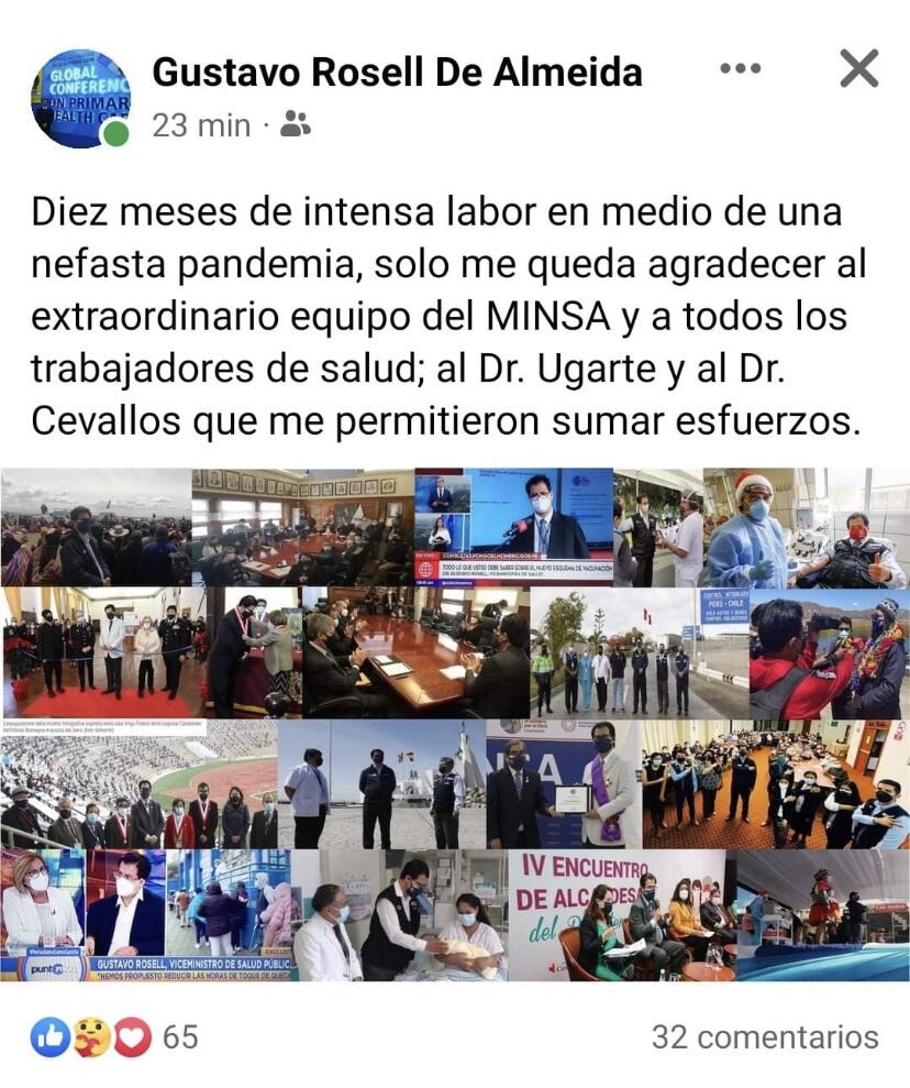 “Diez meses de intensa labor en medio de una nefasta pandemia, solo me queda agradecer al extraordinario equipo del Minsa y a todos los trabajadores de salud”, posteó en Facebook.