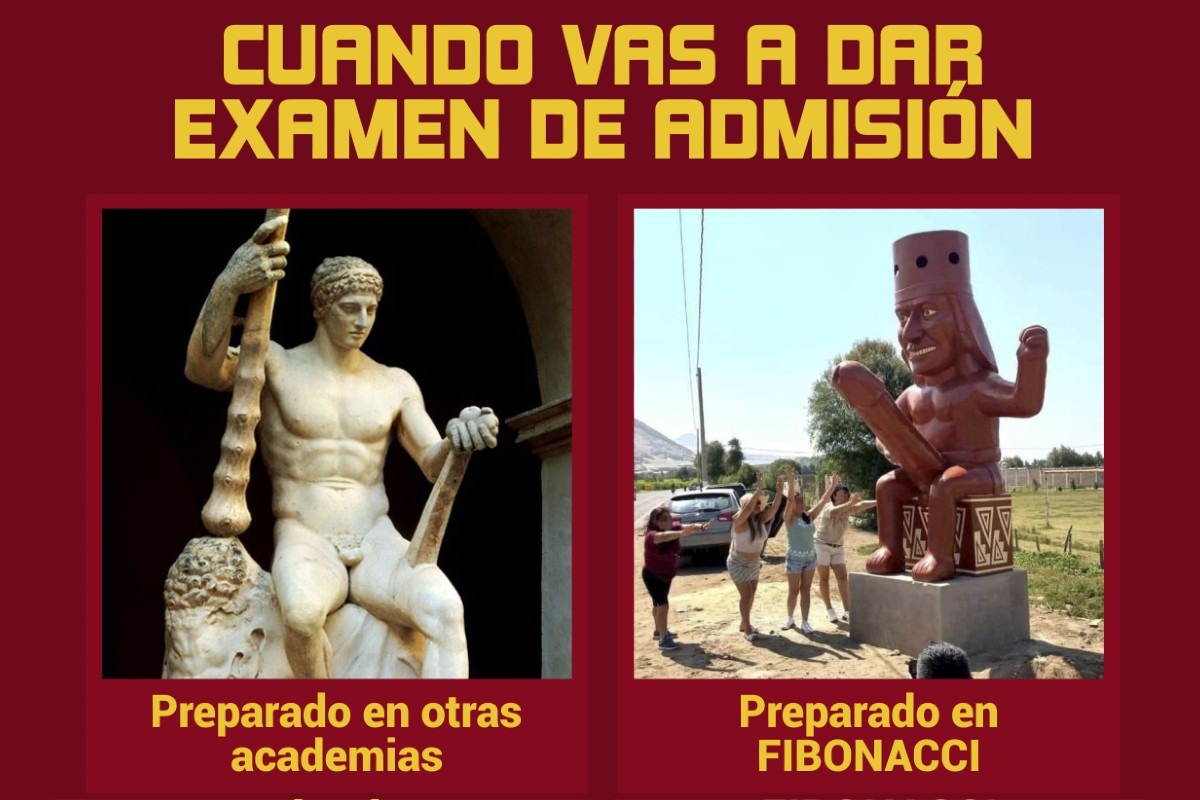 En esta aparece una antigua escultura griega y al lado la réplica gigante del huaco erótico de Moche, con el siguiente lema: “Cuando vas a dar examen de admisión, en ella aparece la escultura griega (Preparado en otras academias) y la imagen del huaco (Preparado en Fibonacci)”