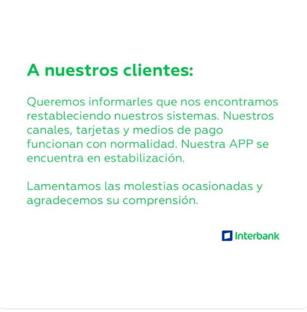 Al promediar las 3:20 p. m. la entidad financiera anunció que ya se encuentran operativos. “Nuestros canales, tarjetas y medios de pago funcionan con normalidad. Nuestra APP se encuentra en estabilización”, agregaron.