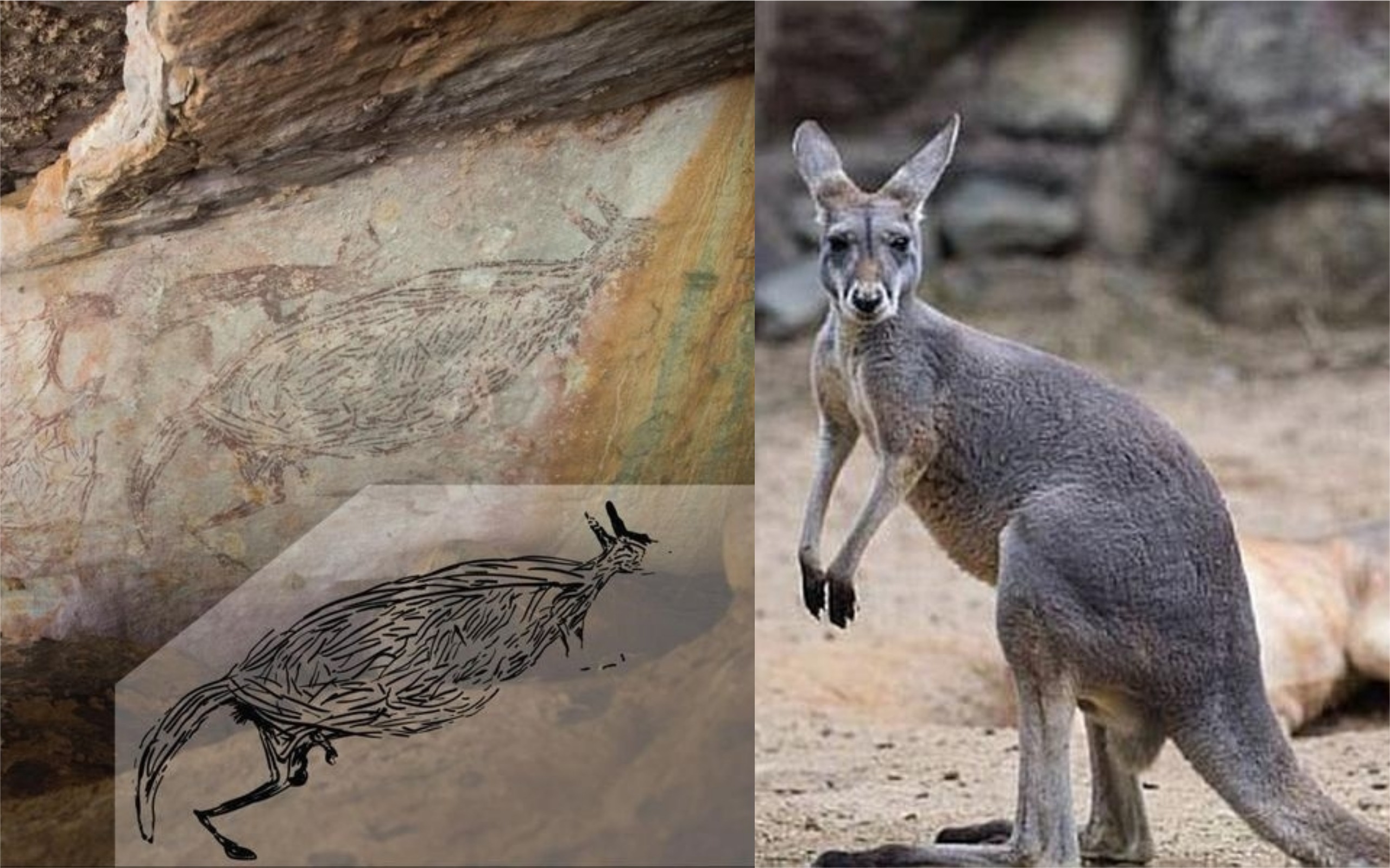 Una representación casi de tamaño natural de un canguro es la pintura rupestre más antigua conocida en Australia. Científicos de la universidad de Melbourne descubrieron recientemente su edad: entre 17.100 y 17.500 años, gracias a una técnica de radiación por carbono.