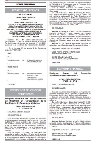 La resolución lleva las rúbricas del presidente de la República, Pedro Castillo, y del presidente del Consejo de Ministros, Guido Bellido.