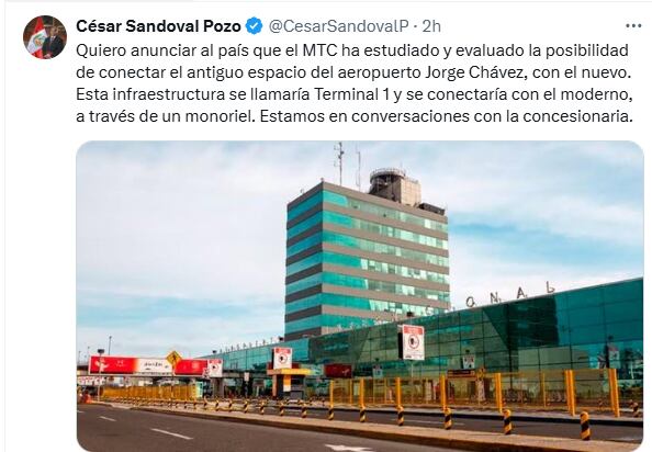 “Quiero anunciar al país que el MTC ha estudiado y evaluado la posibilidad de conectar el antiguo espacio del aeropuerto Jorge Chávez con el nuevo. Esta infraestructura se llamaría Terminal 1 y se conectaría con el moderno a través de un monorriel. Estamos en conversaciones con la concesionaria”, precisó Sandoval en X.
