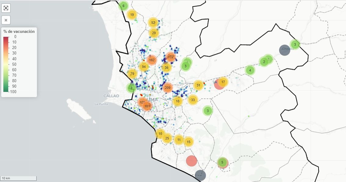 Los mapas de calor también muestran el avance de la aplicación de la primera y de la segunda dosis de la vacuna contra el COVID-19, con detalles de los distritos en los que más personas han sido inmunizadas.