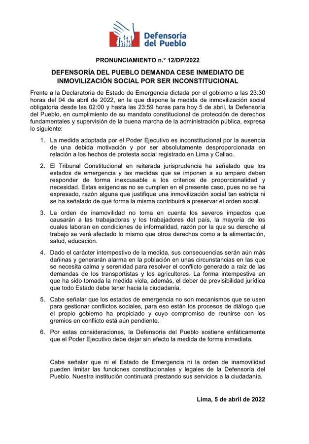 Tras el anuncio de Pedro Castillo, la Defensoría del Pueblo exigió este martes que el Gobierno cese de manera inmediata el Estado de Emergencia que dispuso la noche de ayer, pues consideró que se trata de una medida “inconstitucional” y desproporcionada.