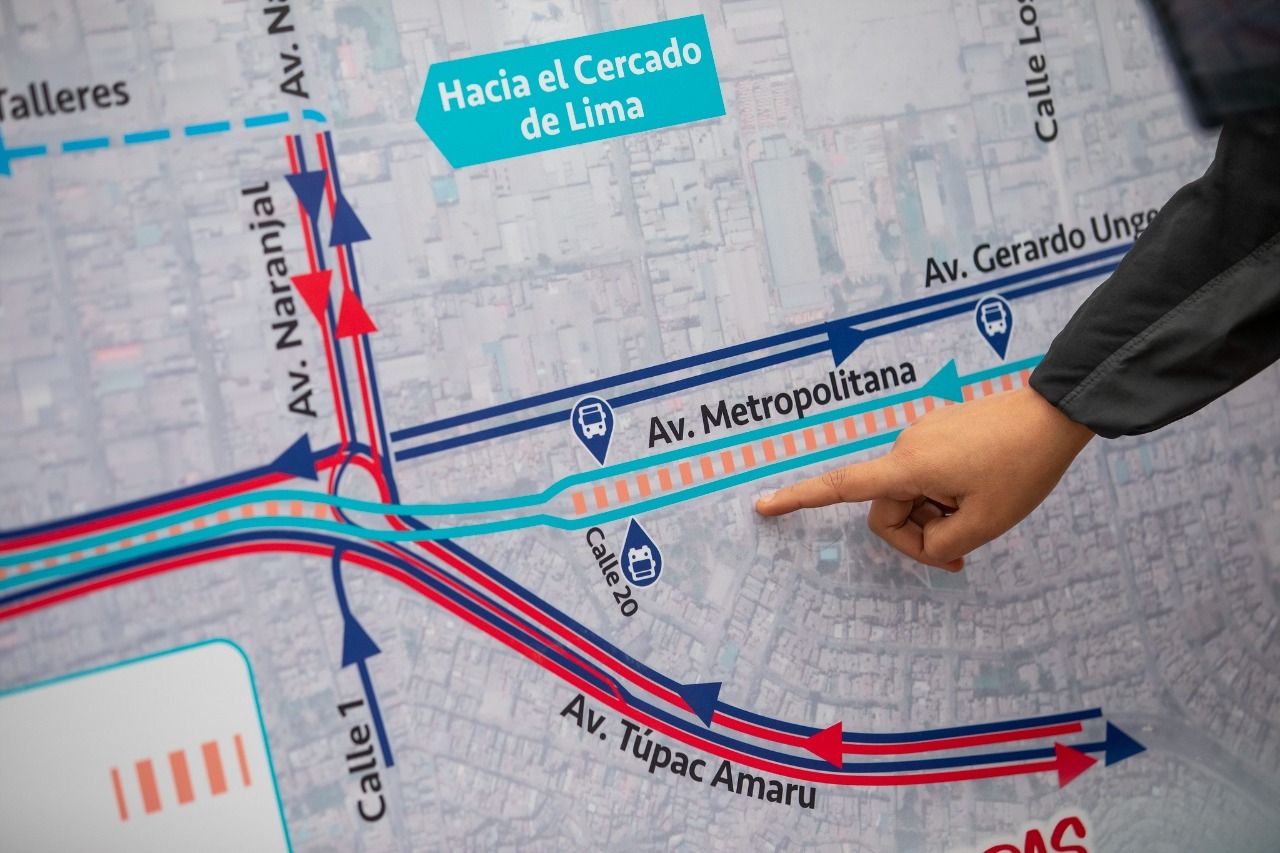 Los vehículos de transporte público convencional y privado podrán circular por las avenidas Naranjal y Túpac Amaru, mientras que los buses alimentadores del Metropolitano irán por las vías auxiliares de la Av. Metropolitana.