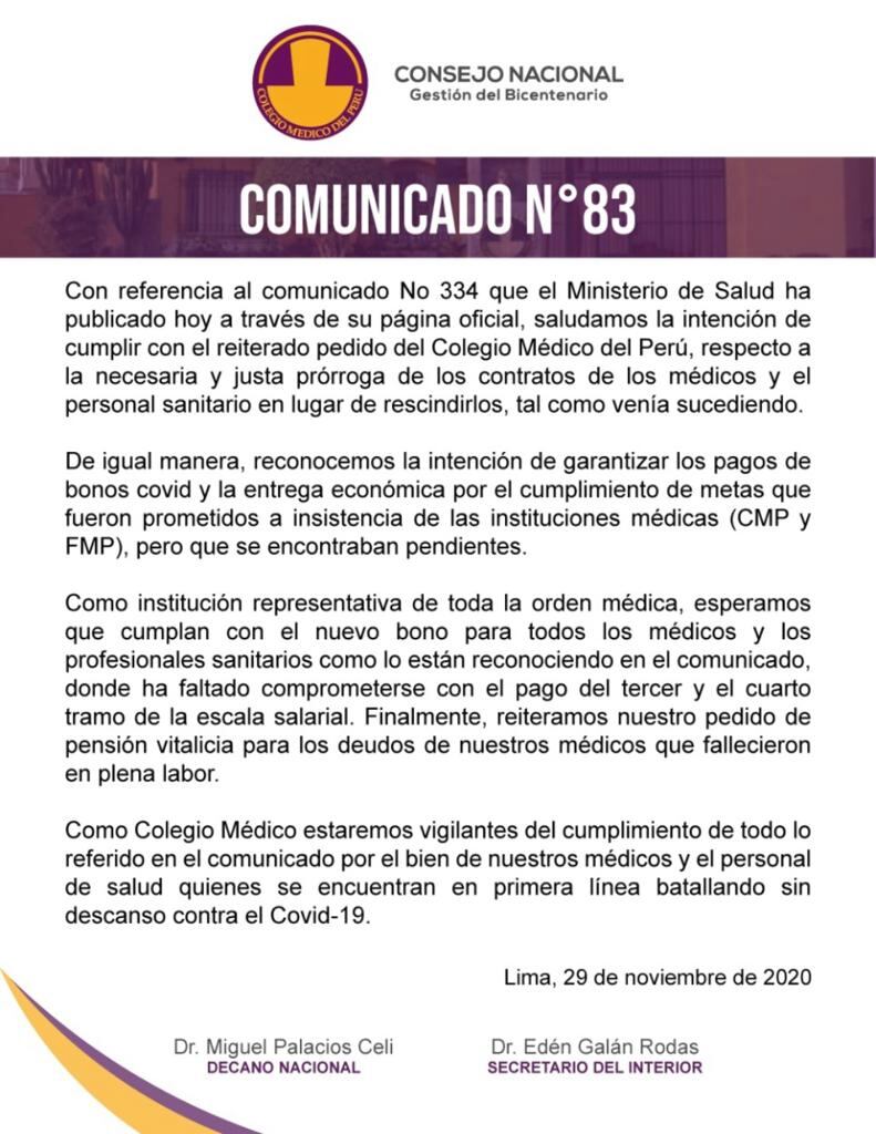 “El Minsa está gestionando la entrega de un bono especial que se anunciará próximamente, en favor de todos los trabajadores de salud, sin distinción”, se lee en el pronunciamiento.