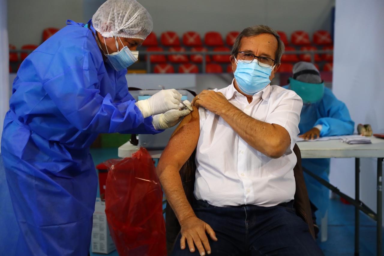 El alcalde de Miraflores, Luis Molina, recibió esta mañana la primera dosis de la vacuna contra el COVID-19 del laboratorio de Pfizer. La inoculación del burgomaestre se realizó en el Complejo Deportivo Niño Héroe Manuel Bonilla, situado en la Av. Del Ejército, y que es uno de los puntos de inmunización en el marco de la jornada de vacunación a adultos mayores de 70 años que inició hoy en 50 distritos de Lima y Callao.