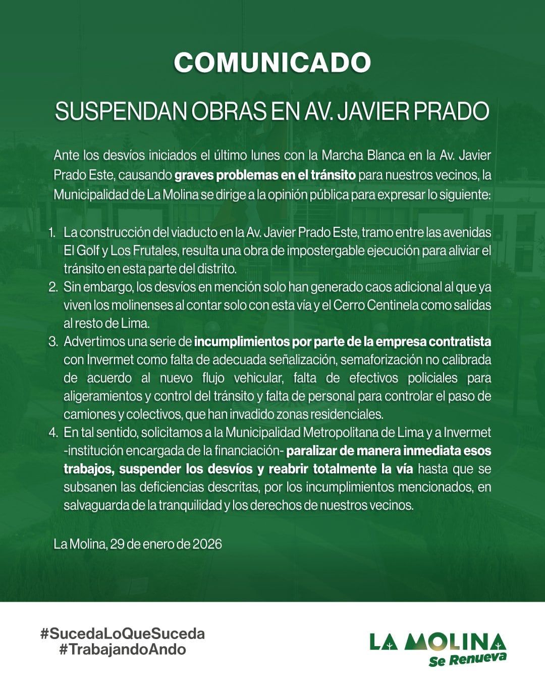 Este jueves 29 de enero por la tarde, la Municipalidad de la Molina emitió un contundente comunicado a través de sus redes sociales, en donde hicieron un llamado a la Municipalidad de Lima para que paralizaran de manera inmediata, las obras en la avenida Javier Prado Este.
