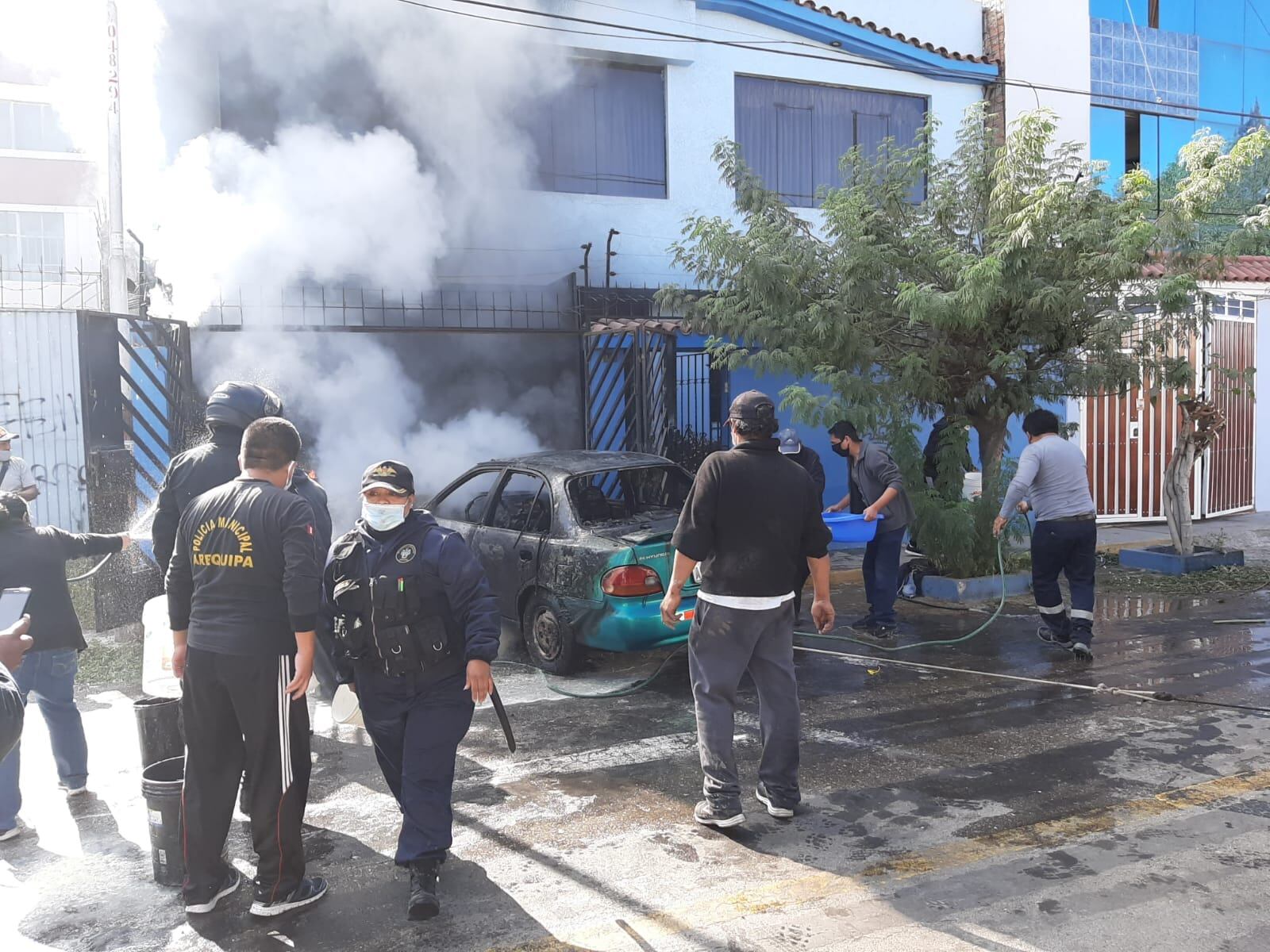 Debido al fuego que, según indicaron, amenazaba al vecindario se contó con el apoyo de la policía municipal y de los vecinos de la zona quienes con baldes de agua trataban de apagar el fuego y también lograron retirar hasta la calle el carro siniestrado.